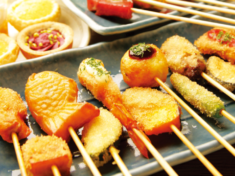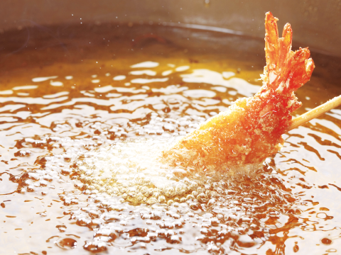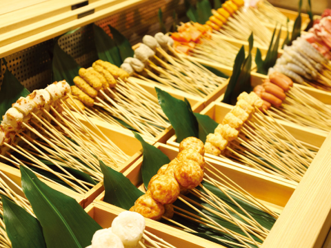 串家物語ではお客様にお好きな食材を選んでいただき、お好みのスタイルで揚げたての串揚げを楽しんでいただくビュッフェスタイルのお店です。お客様に揚げていただくと言っても、使用するねり粉、パン粉やオリジナルソースはどれもこだわりの一品。美味しく、楽しんでいただけるようなお店作りを心がけています。